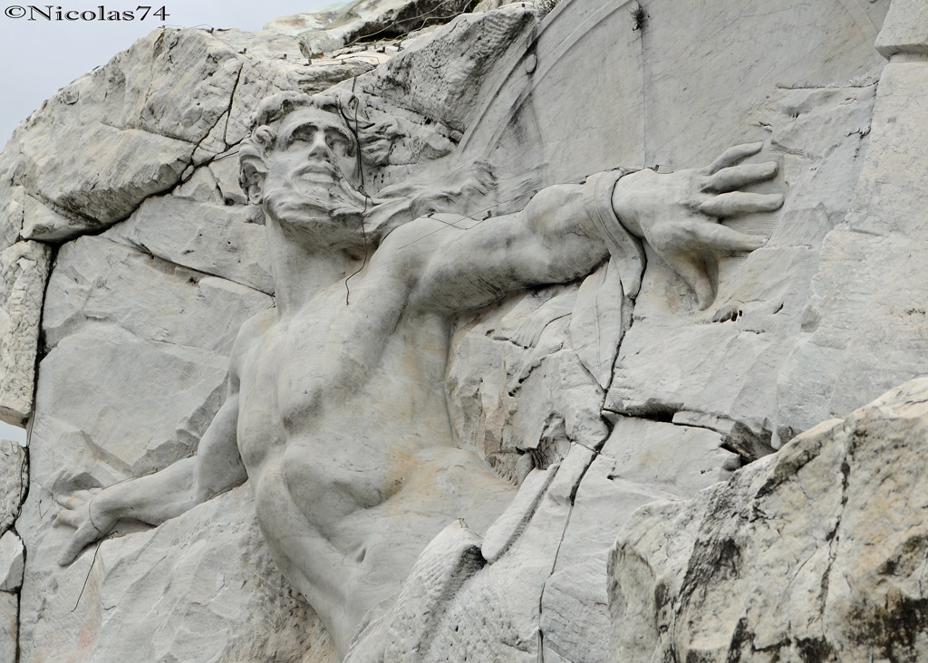 La luce disponibile era molto diffusa e quindi ha dato poca visibilità al rilievo con un soggetto che invece aveva proprio bisogno di mettere in evidenza questo aspetto. Il mio suggerimento sarebbe quello di costruire una composizione più stretta (che tenga fuori lo spicchio di cielo) e maggiormente giocata sulla diagonale data dalle braccia (ruotando lievemente il rettangolo). Una leggera scaldatina ai toni ed una piccola ravvivata al chiaroscuro avrebbero infine prodotto una foto migliore (secondo me). Se non ti spiace ti allego un esempio.