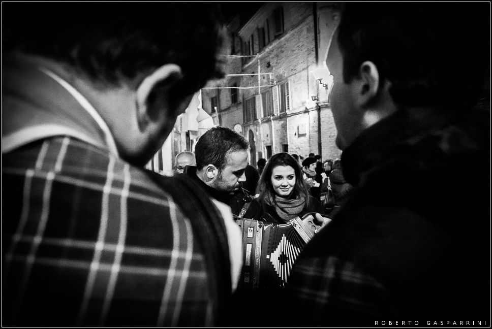 In effetti, anche considerando la gestione della luce, il soggetto mi sembra il "dittico" suonatore-ragazza, con le loro espressioni intense e complementari.