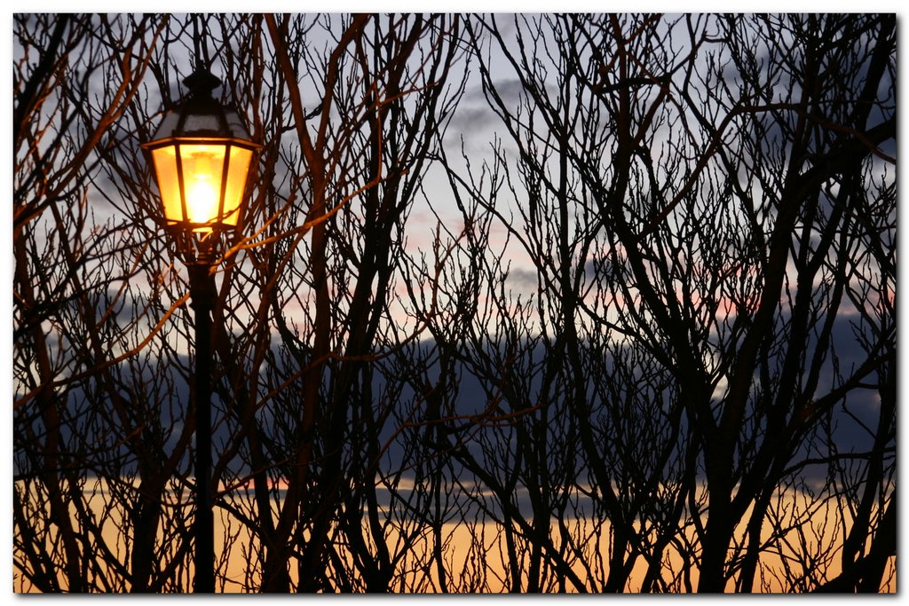 Mi piace molto: grafica, un tramonto discreto (non nel senso di poco bello, ma nel senso di non protagonista) ad arricchire il tutto ed il bel lampione con una luce calda a riscaldare dal freschetto della sera incipiente