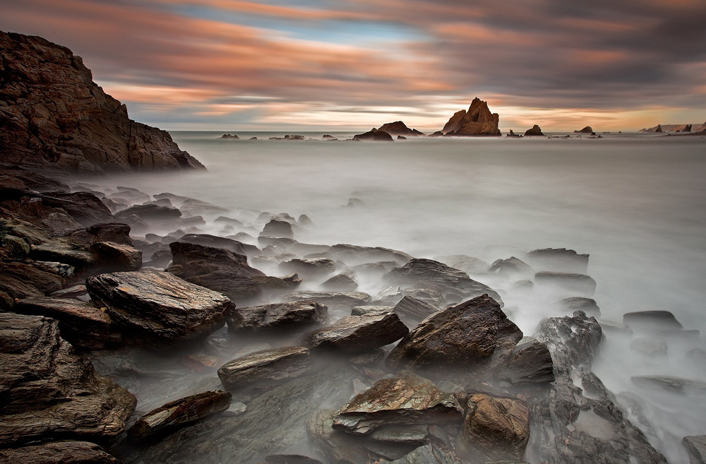 Quando usata nei modi e nei momenti giusti la tecnica dei tempi lunghi restituisce immagini di grande fascino. E anche questa lo è. Composizione efficace, luce che riflettendo sui sassi ne esalta la loro matericita', cielo delicatamente tinteggiato dai colori delle golden hours, scogli che escono dalla setosita' dell'acqua. Una bella foto. Complimenti.