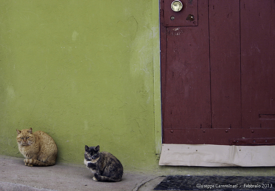 A parte questo ... la fotografia potrebbe già vivere per il piacevolissimo accostamento cromatico, la presenza dei due simpatici felini ne completa il significato.