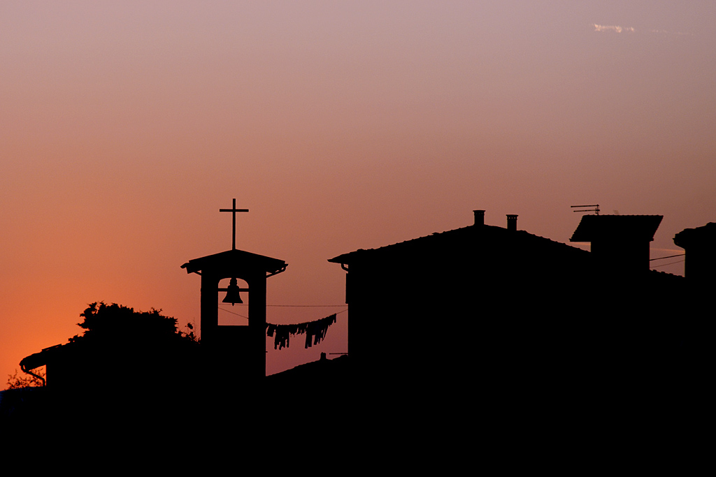 Un bel controluce, dove i profili dei tetti sono ben disegnati sullo sfondo dalle tinte del tramonto. Certo .. manca il gatto...