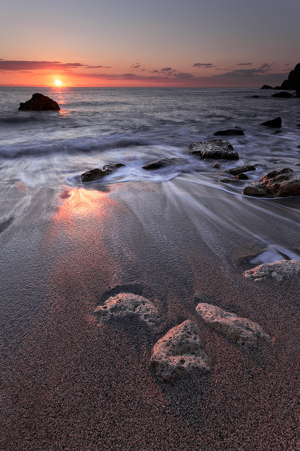 Il riflesso della luce del sole sulla sabbia e sulle pietre in primo piano è molto bello. L'immagine si gusta per il nitore, per i dettagli e per quel lieve trascinamento dell'acqua. Un momento di luce magica che da cuore alla tua fotografia.