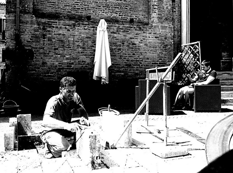 Il problema è che l'alto contrasto "cancella" i particolari compreso quello dell'attività che sta svolgendo quello che immagino sia un muratore, la difficile lettura unita alla quantitò di particolari spinge l'osservatore ad "andare oltre" a lasciare questa tua foto prima ancora dia verla analizzata e il messaggio si perde inesorabilmente, come se non bastasse l'eccessivo contrasto rende "fastidiosa" la lettura del volto del soggetto in primo piano cosa che aumenta il desiderio di abbandonare questa immagine.