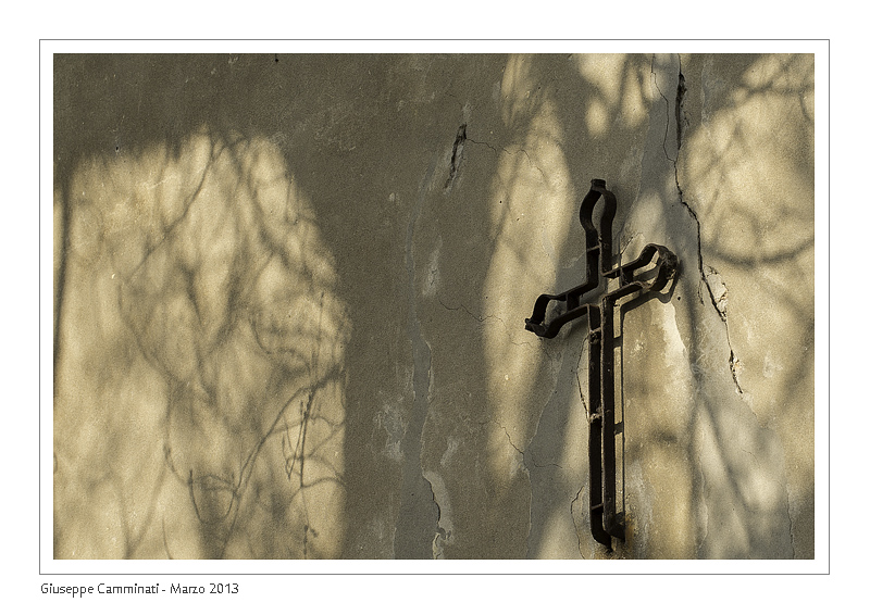 Buona l'idea di decentrare la croce ma avrei lasciato più "aria" sotto e magari giocato con lo strumento "brucia" sulle ombre per creare un'atmosfera meno piatta