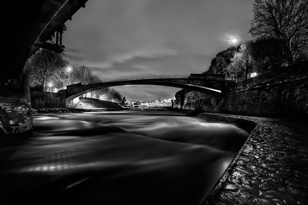 Un gran bel bianco e nero dai toni cupi, come si addice ad un "notturno" urbano. Forte l'effetto setosissimo dell'acqua con i neri, i bianchi ed i grigi.