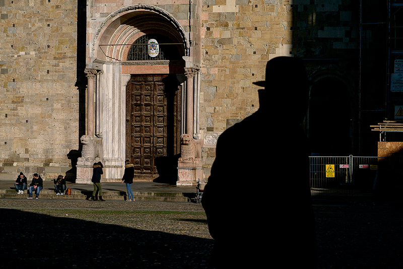 Interessante l'ombra che sembra emergere -o immergersi nel- dal buio ad osservare la vita reale a cui sembra precluso.
