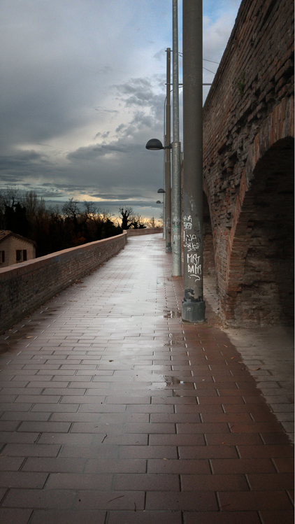 ...la bella prospettiva, i lampioni che creano una piacevole successione, la malinconia dei colori tenui e bellissimi dell'ora giusta, un cielo evocativo, romanticismo con il pavimento bagnato e i riflessi...