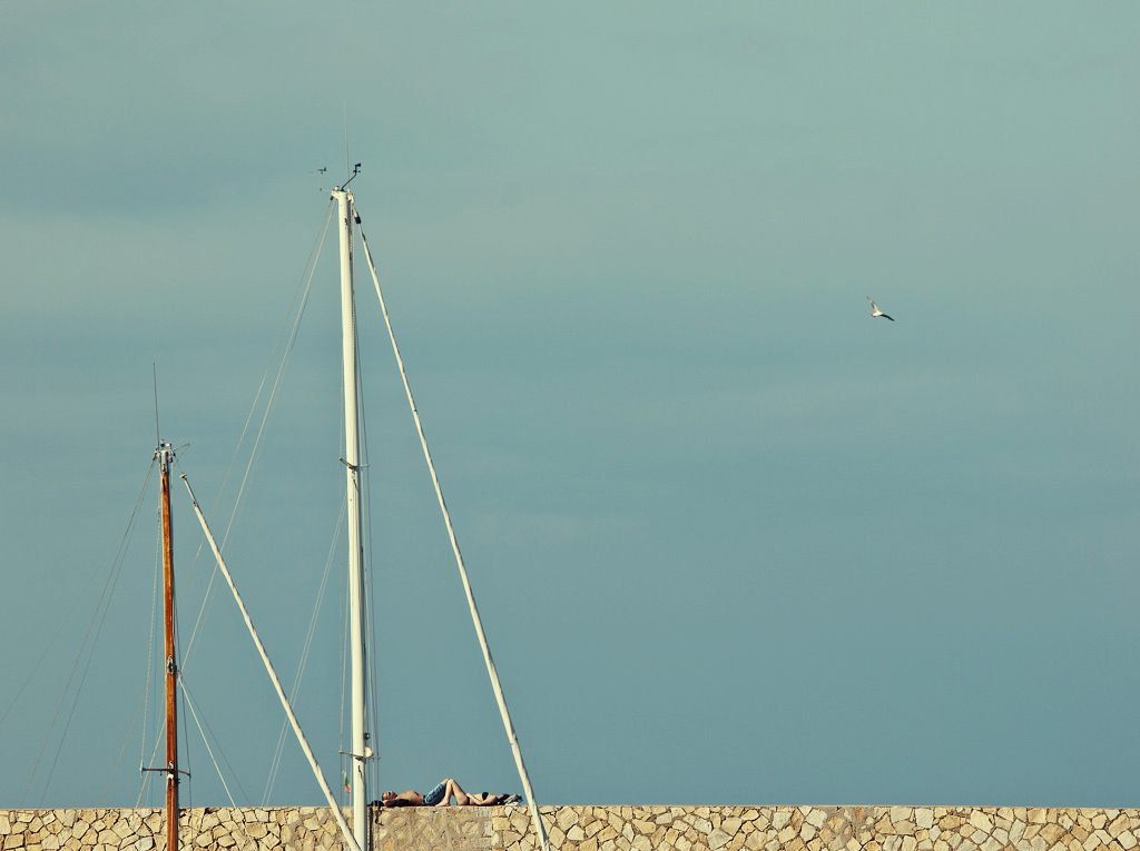 ECCOLA: Un condensato di elementi che, per il tuo occhio, che ha saputo dar corpo visivo alla fortuna, si sono cristallizzati al sole per ogni osservatore. Un orizzonte virtuale di pietre a comporre il muretto: solida base per la coppia dispesa ed anche per la nostra immagine; ed oltre...l'azzurro verde di un cielo vuoto su cui regna solitario il volo di un gabbiano. I due incapsulati nel triangolo degli alberi marinari, come in una piccola geometria vivente, mentre la leggera pendenza degli alti alberi, da sola ci riporta alla realtà, raccontando la lieve oscillazione della barche che fluttuano posate sull'acqua invisibile sottostante. Uomini, cielo e natura, in un unico, praticamente irripetibile, delizioso quadraeto vitale.