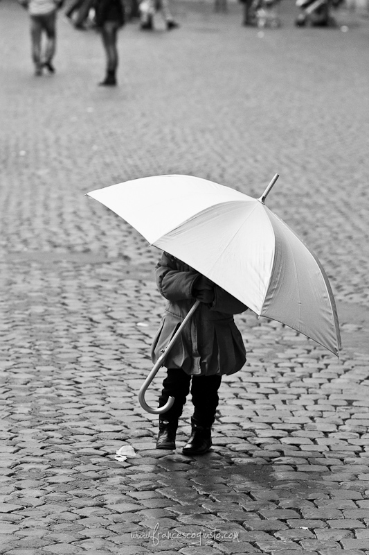 Quanta tenerezza c'è in questa bimba che impugna un ombrello visibilmente più grande di lei: quel bianco mi pensare ad un pulcino non del tutto sgusciato da un uovo.