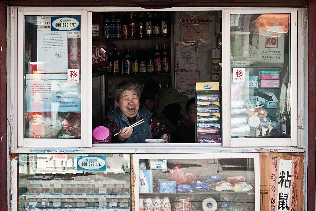 Una simpatica esercente in un mercatino di Shanghai durante la pausa pranzo.