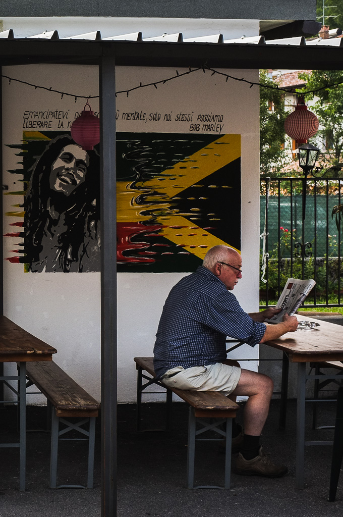 A me quello che intriga in questa fotografia è il contrasto fra due mondi; quello che legge il Messaggero sarà sicuramente lontanissimo dal quello del buon Bob