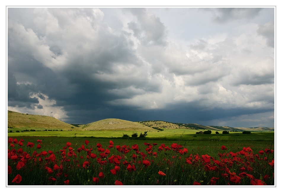 Molto buono il momento colto, con il gioco delle luci sulle coline della piana ed il pp floreale in ombra. Un cielo tumultuoso fa da degna cornice a questa bella ripresa. Nella fotografia paesaggistica il flash e' un accessorio da lasciare a casa (almeno per come la vedo io).