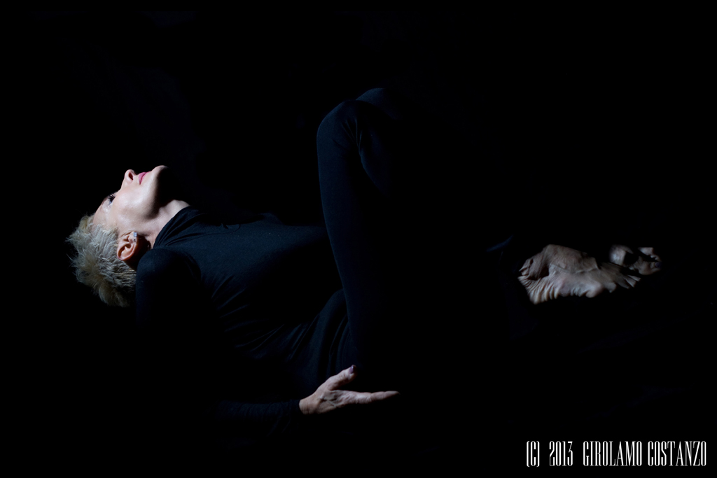 Il piede teso, la mano che sorregge il fianco, il volto nella luce piena. tutto il resto è un regalo di blu contro il nero. Così teatrale ma umano questo lavoro, nella forza delle vene che sporgono tridimensionali, quasi una carta di identità della protagonista.