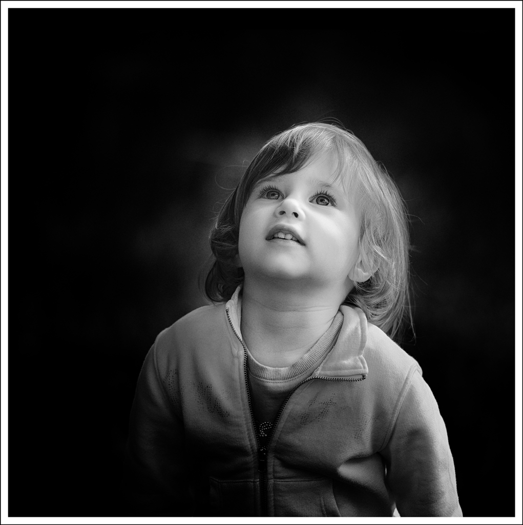 questo bn è molto bello! Del soggetto già è stato detto, credo che tutti i fotografi vorrebbero avere una bimba così da riprendere. Forse qui, visto lo splendido contrasto tra il volto è il fondo scuro, io che non amo troppo il post, avrei tolto l'alone chiaro attorno ai capelli è un mio parere naturalmente.