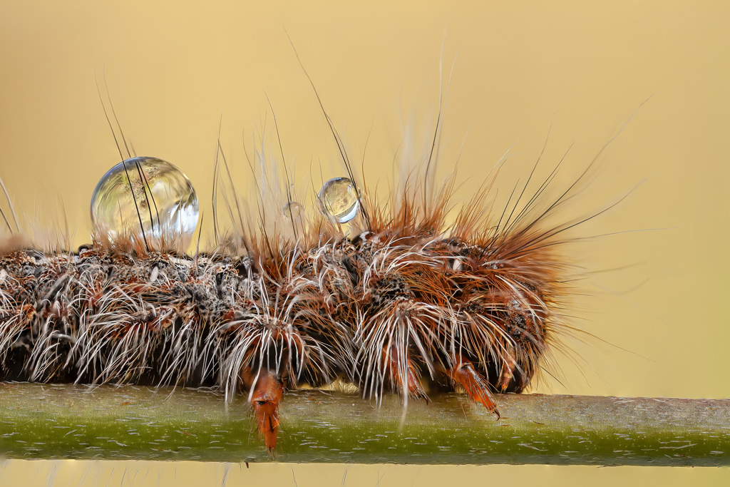 Ciao Giuseppe...la definizione sulle due goccioline d'acqua è perfetta...e naturalmente sono loro i soggetti messi in risalto, in questo caso il bruco funge solo da posatoio, resta relegato in secondo piano...tuttavia sbilancia un poco la composizione...ma, oltre che gusti personali, riconosco che l'intenzione della massima resa sull'acqua pretende qualche sacrificio...bravo, un buon lavoro.