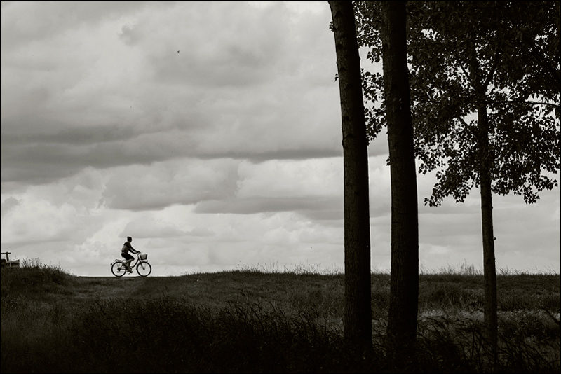 Mi piace per l'utilizzo di terra ed alberi a definire un riquadro nel quadro, una sorta di spazio circoscritto, nel quale individui solo la persona in bici che si staglia sulle nuvole...mi ha ricordato un po' la scena di ET quando i ragazzini in bici si alzano pedalando verso il cielo.