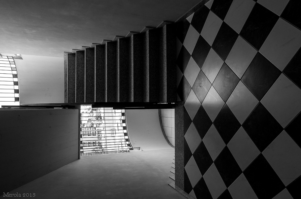 Beh, non proprio come la famosa ''Salita e discesa'' di Escher, nel quale file di persone salgono o scendono una scala chiusa in un ciclo infinito, su una costruzione impossibile da realizzare, ma avvalendosi di stranezze della percezione e della prospettiva è stato possibile disegnarlo..a te è stato sufficiente ruotare una location che la moltitudine di linee si presta a questo gioco di prospettiva impossibile, per avere un'effetto decisamente coinvolgente...