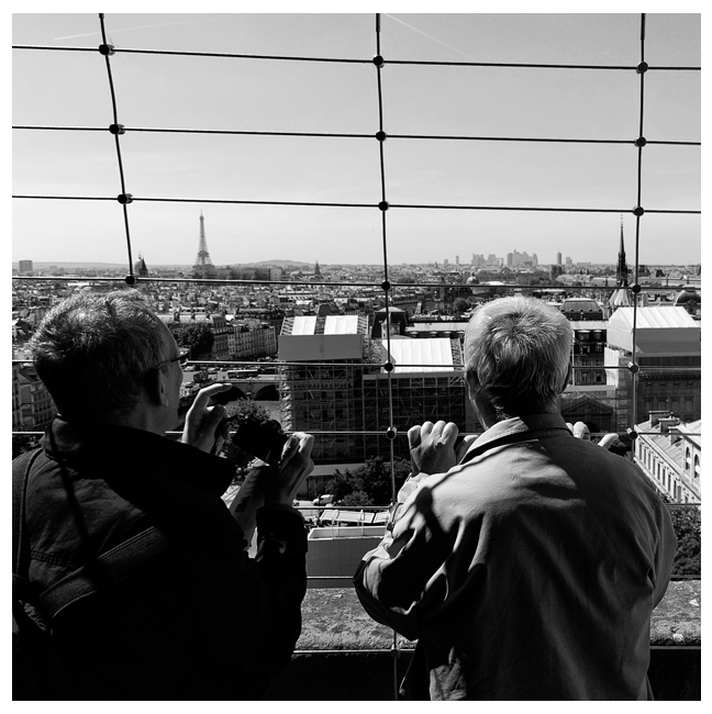 Non mi convince molto, manca un gesto che caratterizzi lo scatto oltre alla veduta del paesaggio dall'alto. C'è quel dito che punta, ma altrove rispetto alla Torre Eiffel che attira per la sua riconoscibilità.