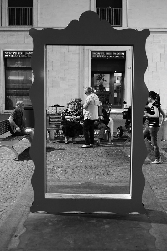 Riguardandola al pc anche a me ha dato quel senso di straniamento, in fase di composizione non me n'ero accorto, e ammetto d'aver avuto un po' di fortuna: lì per lì ho pensato di sfruttare la cornice per inquadrare le persone nelle panchine, uno scatto forse strano ma piuttosto "classico".