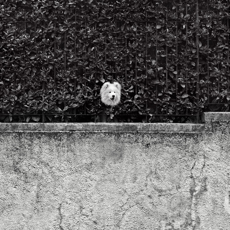 A me non dispiace il muro basso chiaro, sembra bilanciare la bianca testa del cagnolino