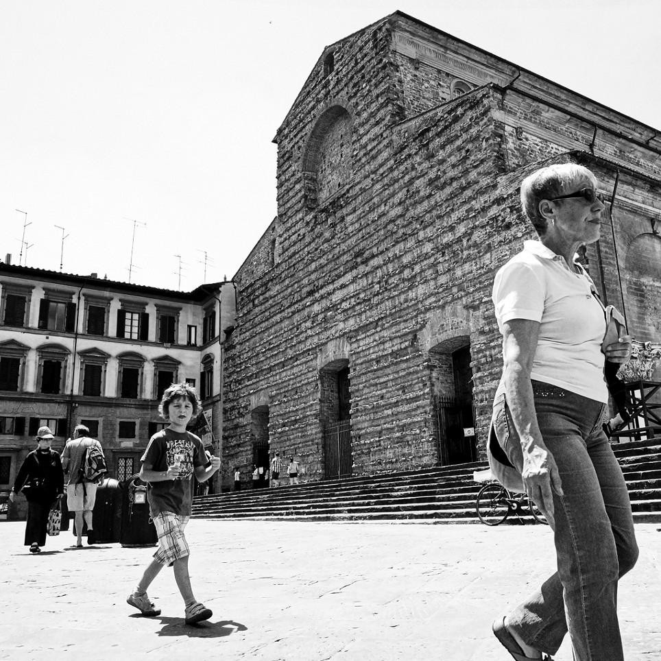 Mi piace l'inquadratura e il punto di ripresa ad una altezza simile all'unico soggetto che guarda in camera, il bimbo. Mi sembra però troppo eccessiva l'esposizione, il pavimento di San Lorenzo appare bruciato. Bella comunque la diagonale che percorrono i tre soggetti, quasi in fila indiana. Mi piace anche il fatto che tu abbia lasciato, volontariamente o necessariamente, la donna a destra quasi fuori dal fotogramma, come per lasciar immaginare all'osservatore il proseguimento dell'azione fuori dalla foto.