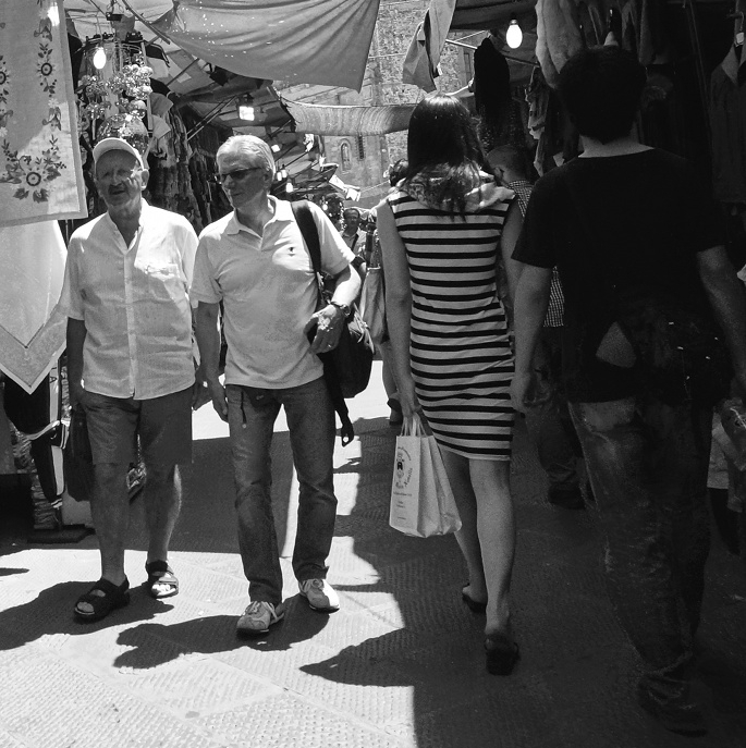 di questa scena mi ha colpito come il ragazzo in ombra sia vestito di scuro, la ragazza a righe è a metà tra la luce e l'ombra e i due a sx sono alla luce e vestiti di bianco. E' stato questo glissare di toni che mi ha fatto scattare.