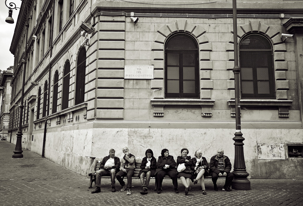 Lo scatto non voleva avere una valenza puramente street, ma cercare di raccontare l’abitudine alla chiacchierata per strada (siamo nel quartiere ebraico di Roma), questo almeno era nelle mie intenzioni, anche perché la gestualità dei ‘panchinari’ da sola non mi sembrava particolarmente interessante; forse avrei dovuto allargare di più sulla strada per inserire meglio i soggetti nel loro quartiere ma si sarebbe persa la frontalità della panchinona.