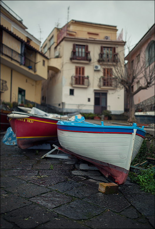 Secondo me un pò stretta ai lati; l'apparente senso di 'soffocamento' laterale, si risolve peraltro nella scelta compositiva che guida lo sguardo inizialmente verso la casa sulol sfondo e poi dritto verso il cuneo di cielo che si apre sopra...una tonalità 'spenta', appena ravvivata dai colori delle barche, che mi piace molto....rende l'idea di una umida e piovigginosa giornata invernale nel borgo marinaro....cenettina da Don Alfonso a Sant'Agata?