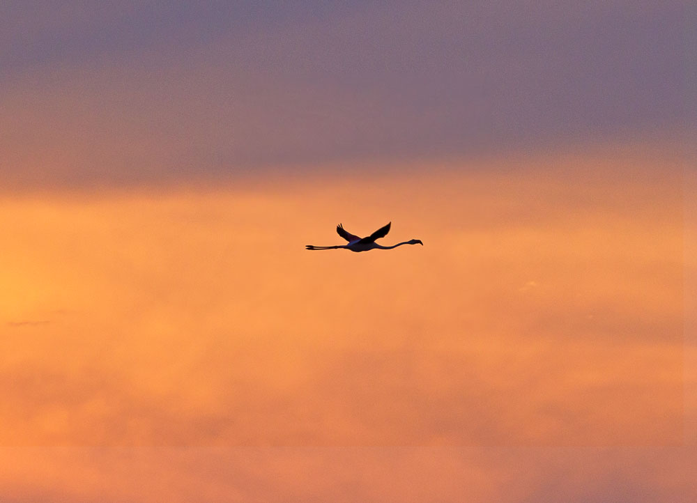 nel complesso, mi piace il risultato: foto essenziale, valorizzata dai dei colori del cielo e dalla posa e leggibilità del fenicottero in in controluce...