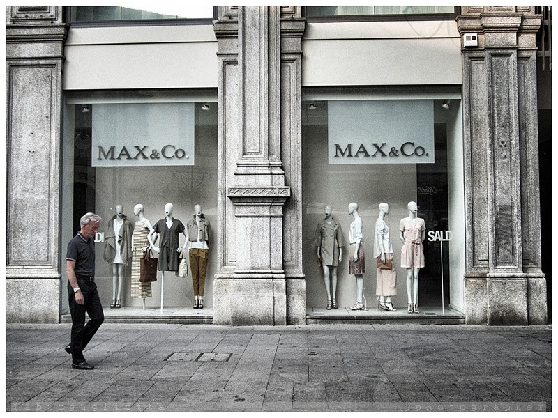 Forse, almeno sul piano formale, sarebbe stata piú efficace se avessi aspettato che la persona si trovasse al centro, davanti alla colonna che separa le due vetrine.