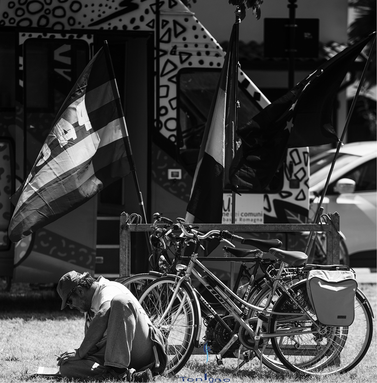 Come lo capisco? Che relazione c'è tra la festa della liberazione e una persona seduta ai piedi di biciclette?