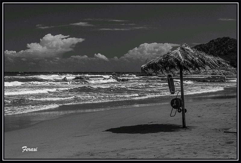 Mi sembra un po' troppo cupa nei toni. Avrei cercato una composizione nella quale l'ombrellone non impattasse con la montagna sullo sfondo.