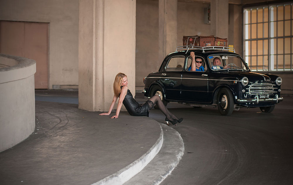 Set ben costruito dall'auto alle valigie alle autoreggenti della modella.