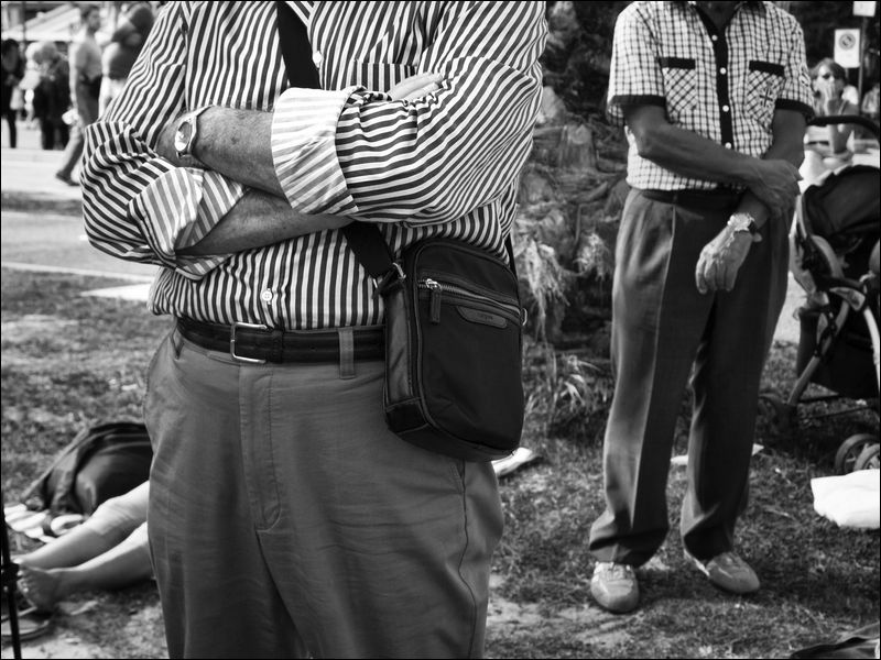 In maniera sequenziale mi attirano in particolar modo la posa delle mani, dall'uomo col borsello in primo piano , passando per l'uomo con orologio sulla destra e per finire la donna.