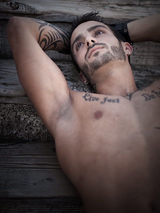 Ed è così che i contorni di quell'immagine di "guerriero metropolitano", ..di quella fisicità maschia e piena di vigore, si sciolgono nell'abbandono languido di uno sguardo che pare addensarsi di mille sogni, quasi seguisse il flusso di pensieri che scorrono come il nastro di un registro emozionale intimo e segreto, scivolando oltre il margine del proprio orizzonte privato.