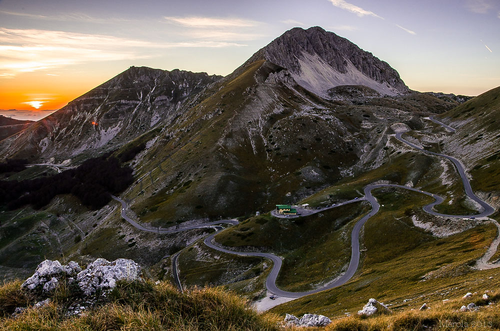 ottima la composizione con la montagna al centro tra il tramonto a sx e un cielo ancora azzurro a dx