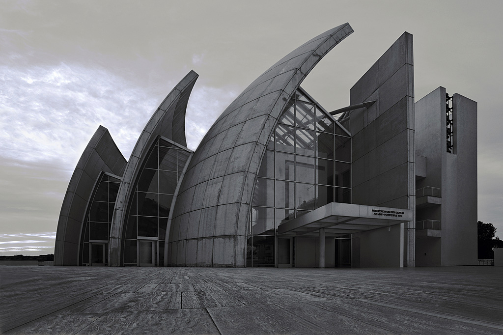 | Piergiulio conosco abbastanza bene questa chiesa e la sua storia sia per aver vissuto la sua genesi da abitante del quartiere, abitavo in quelle zone allora e ricordo ancora la baracchetta che fungeva da chiesa in attesa della sua realizzazione, che per averci fotografato alcuni matrimoni, la sua caratteristica principale è la luce, amplificata dal bianco della struttura, e guidata all'interno dalle vetrate ora, salvo che il tempo non abbia cancellato il bianco sostituendolo con il grigio, processo inverso rispetto a quello attuato sui miei capelli, questa foto è troppo scura, grigia e annulla quello che era l'intento del Meir di creare una chiesa di luce, tutto questo potrebbe rientrare nell'interpretazione della fotografia di architettura ma, a mio avviso, uno dei principi di questa branca è nel rispetto dell'idea dell'architetto e qui più che luce vedo il buio, esatta antitesi dell'idea del Meier. |