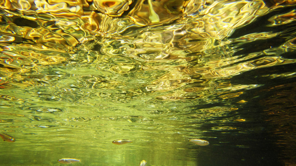 Ciao Ale, è una fotosub fatta a pelo d'acqua, ho visto i pesciolini, il sole del pomeriggio illuminava con tonalità calde la superficie e io ho rivolto l'obiettivo verso l'alto, la superficie stessa ha fatto da specchio e ha rimandato indietro l'immagine dorata. Un saluto da Arturo e grazie per il tuo delizioso commento ciao
