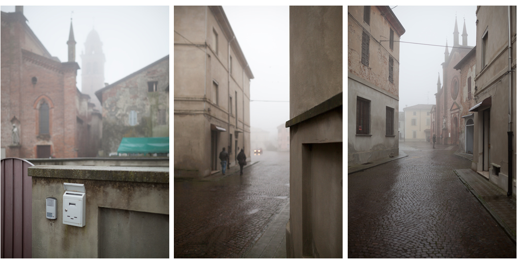 Come è lieve queso trittico, con le presenze appena accennate, la nebbia e le leggere sfumature di colore degli edifici.