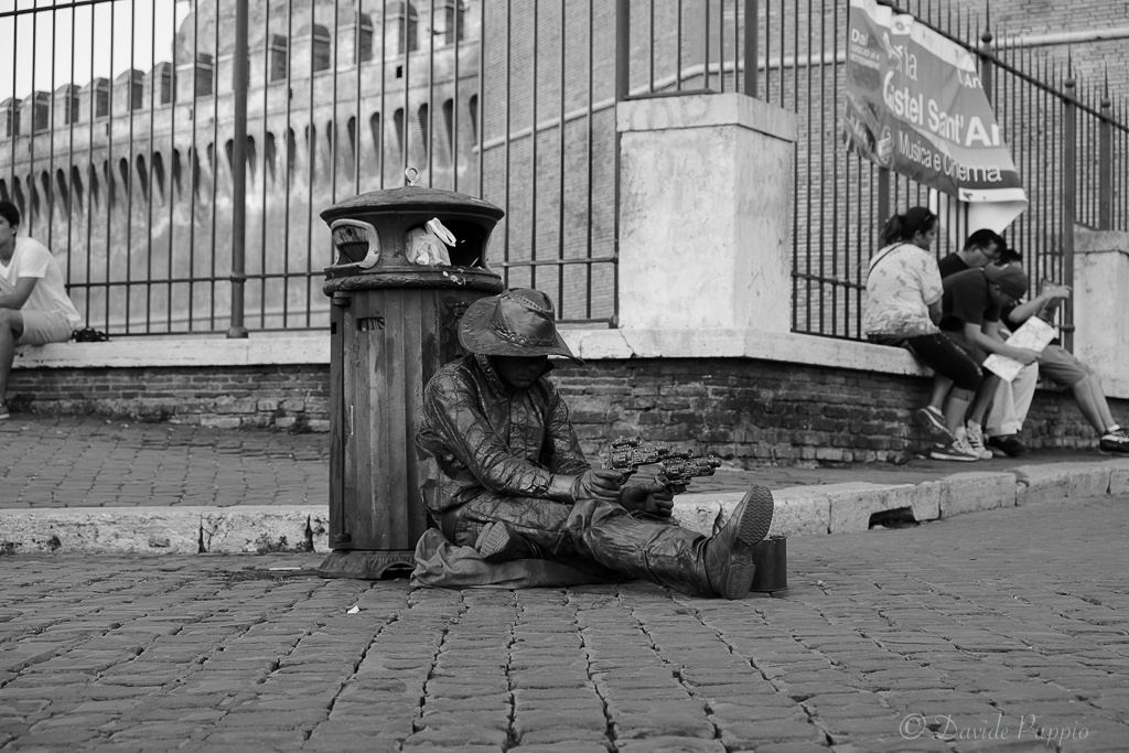La spostiamo in Varie che è la sezione dove sul forum siamo soliti inserire le foto agli artisti di strada, nelle quali non c'è una particolare relazione con il contesto circostante che possa giustificare e sviluppare il carattere street. Per farti un esempio anche semplice e banale, se quella coppia di pistole fosse stata puntata contro un ignaro passante, il contenuto sarebbe stato già diverso.