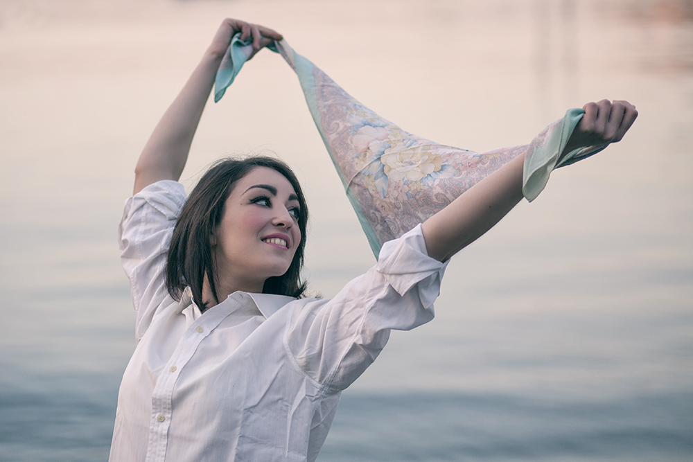 Qui la posa riempe con eleganza l'intero frame,ma non è da meno lo sfondo,quel tuo mare solo intuito che riverbera toni caldi e sommessi sulla bella modella.