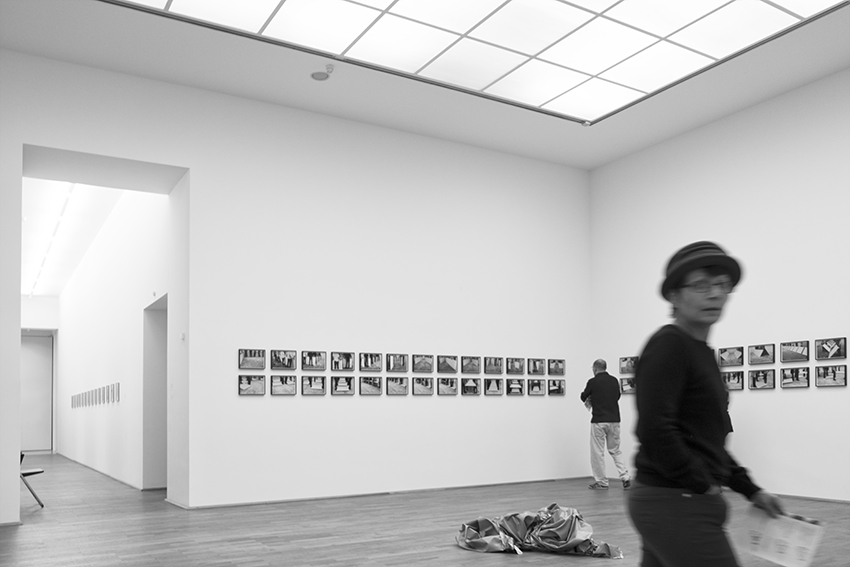 Personalmente non trovo che il bianconero e la geometria austera della location interagisca in modo chiaro con la presenza fortuita e mossa del soggetto in primo piano,