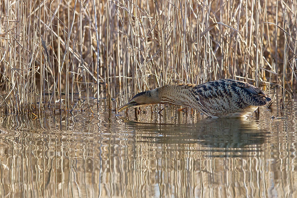 Si apprezza il mimetismo del tarabuso ma lo sfondo e, soprattutto, i riflessi nell'acqua, lo fanno risaltare in tutta la sua bellezza.
