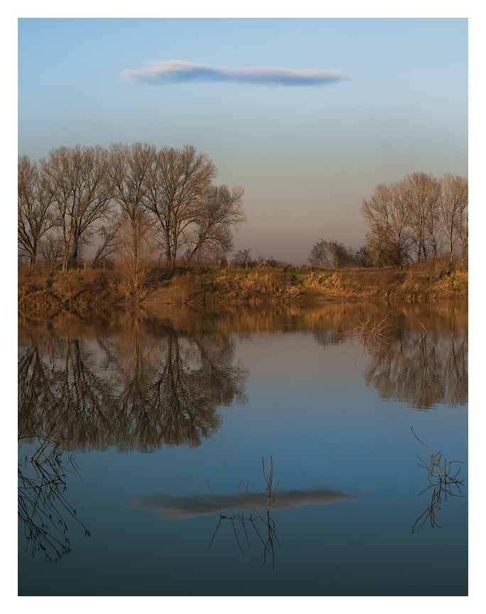 La semplicità compositiva, la calda luce del finire della giornata, la nuvola che veglia dall'alto ed il suo riflesso, la teoria di alberi interrotta e poi ripresa, sono tutti elementi che mi fanno apprezzare molto questo tuo scatto.