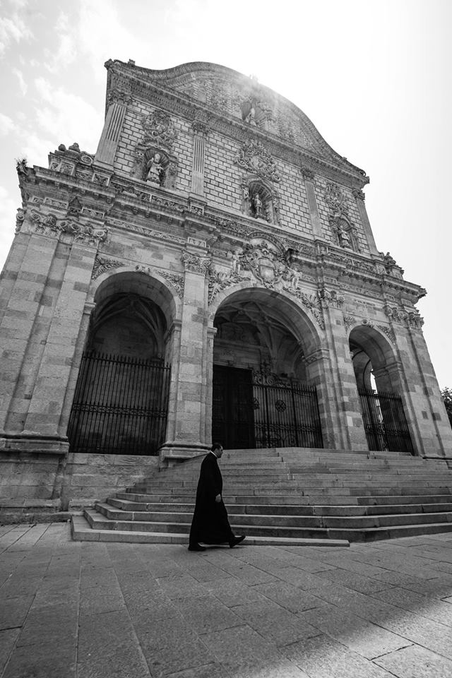 Mi piace il grandangolo che distorce, il controluce attenuato dalla facciata che toglie sempre qualche dettaglio ma che si può considerare un segno divino visto il tema....e pure il bianco e nero un po' mi garba...