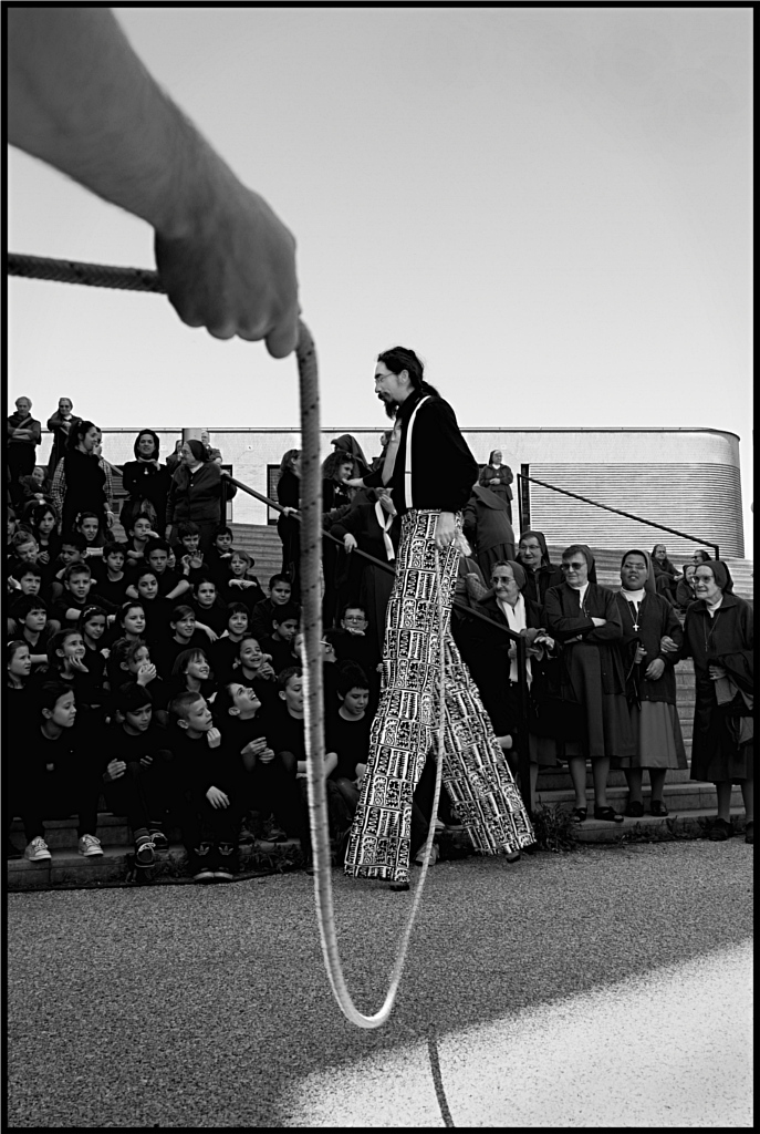 la mano in primo piano che regge la fune suggerisce tensione, suspense, attesa per un numero da giocoliere,
