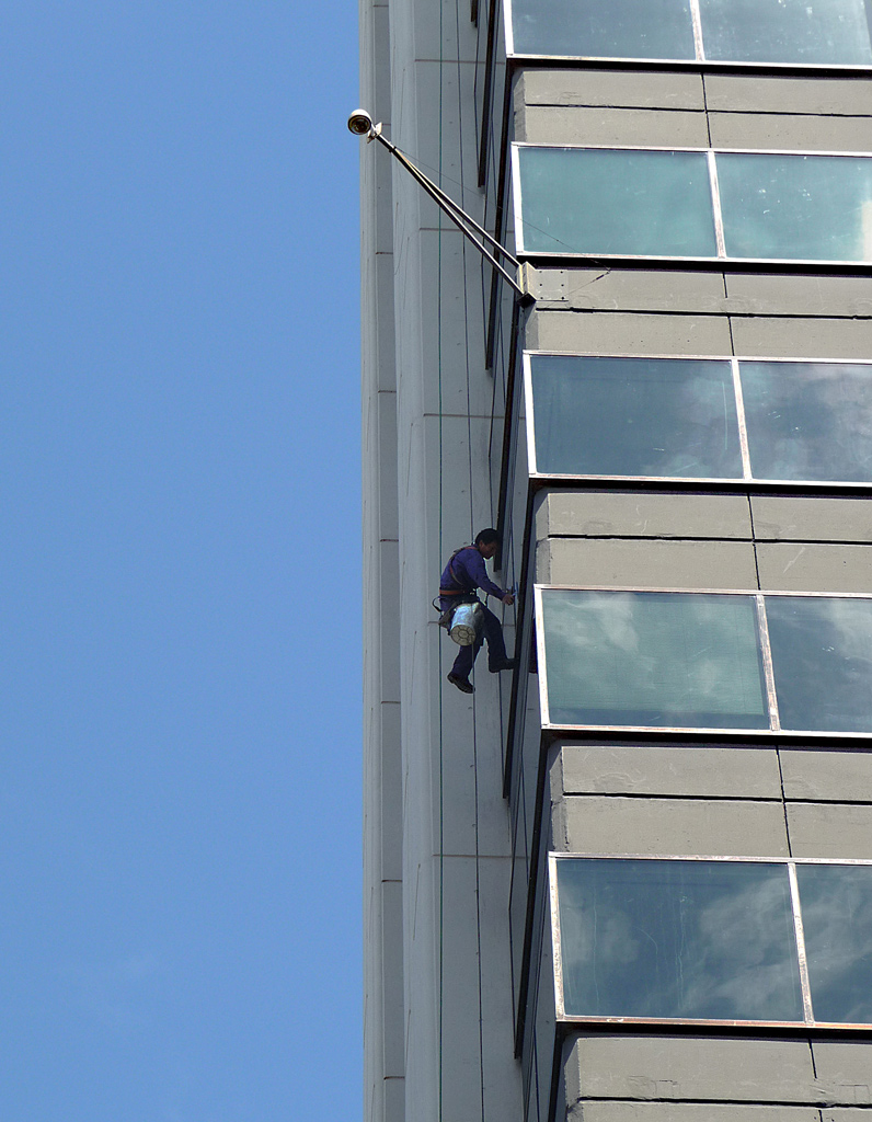 Che vita difficile! (Ma dove siamo? Non in Italia). Chissà se non avresti ottenuto un effetto "brivido" maggiore tagliando appena al di sotto dell'elemento sporgente in alto, così da lasciare un vuoto maggiore sotto l'operaio.