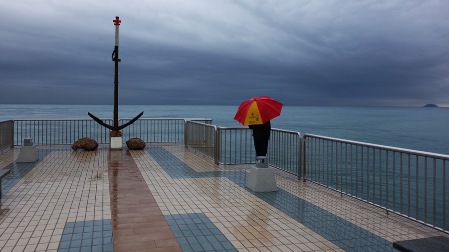L'atmosfera che regala il temporale sul mare è impareggiabile, le mattonelle della tonalità dell'acqua, l'isolotto con la schiarita dietro, la statua con l'ombrello...( scusa, è una sovrapposizione.. )