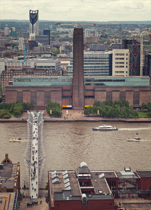 Il ponte pedonale è stato inaugurato lo stesso anno in cui fu aperta la Tate (l'edificio originale è ovviamente più vecchio), in una posizione che probabilmente era stata pensata più per il collegamento diretto con St Paul, che per la somiglianza e la vicinanza con la ciminiera della Tate ...ma chissà se non ci pensò per un attimo pure l'architetto